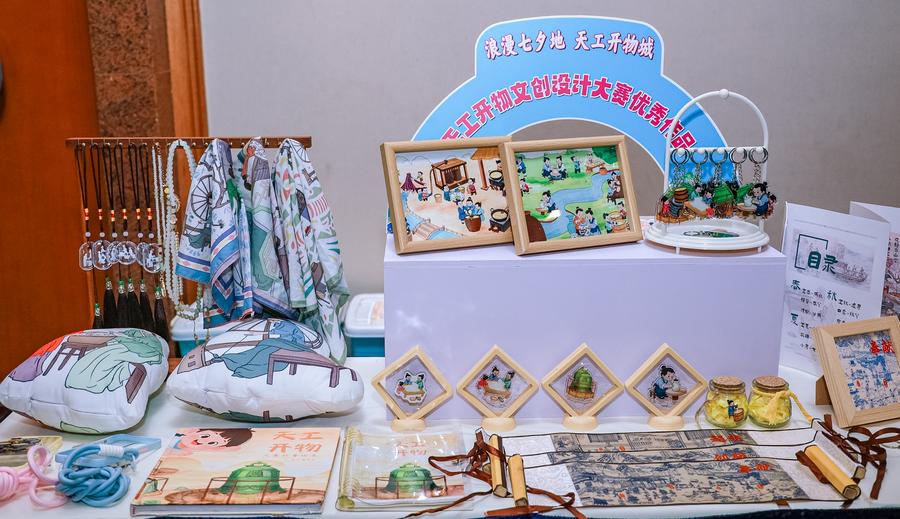 11日、「天工開物」円卓会議の会場に展示された関連グッズ。(北京=新華社配信)