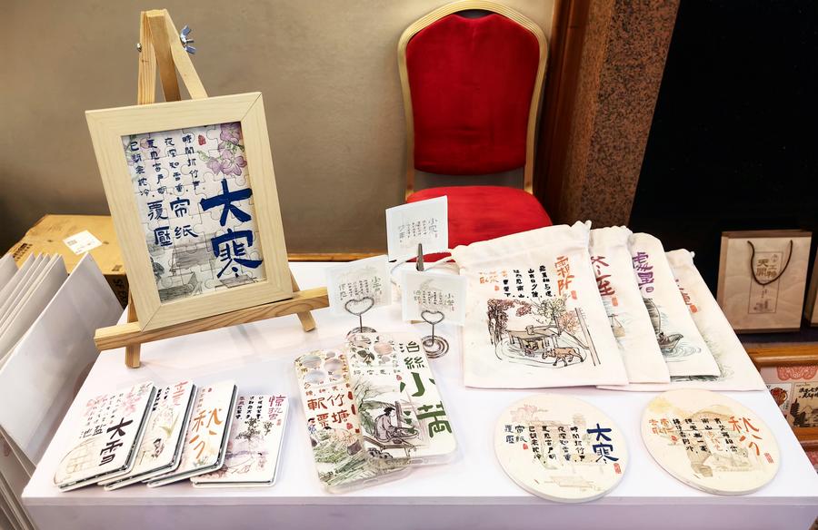 11日、「天工開物」円卓会議の会場に展示された「二十四節気」関連グッズ。(北京=新華社記者/呉寒氷)
