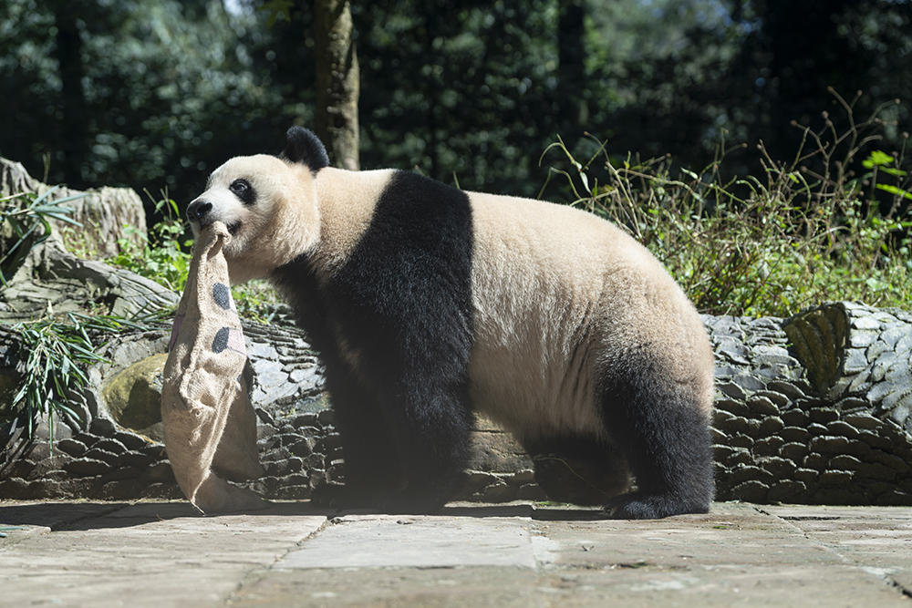 袋をくわえたシャンシャン。(10月27日撮影、成都=新華社配信/Panda365提供)