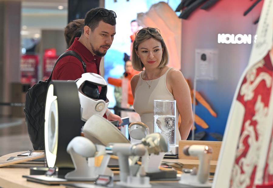 9日、海南省三亜市の三亜国際免税城で、新たに免税品目に追加されたデジタル周辺機器を選ぶ人。(三亜=新華社記者/郭程)