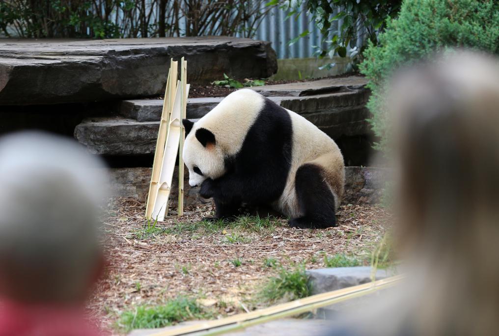 10日、オーストラリアのアデレード動物園で遊ぶ雌のパンダ「怡蘭」。(アデレード=新華社記者/馬平)
