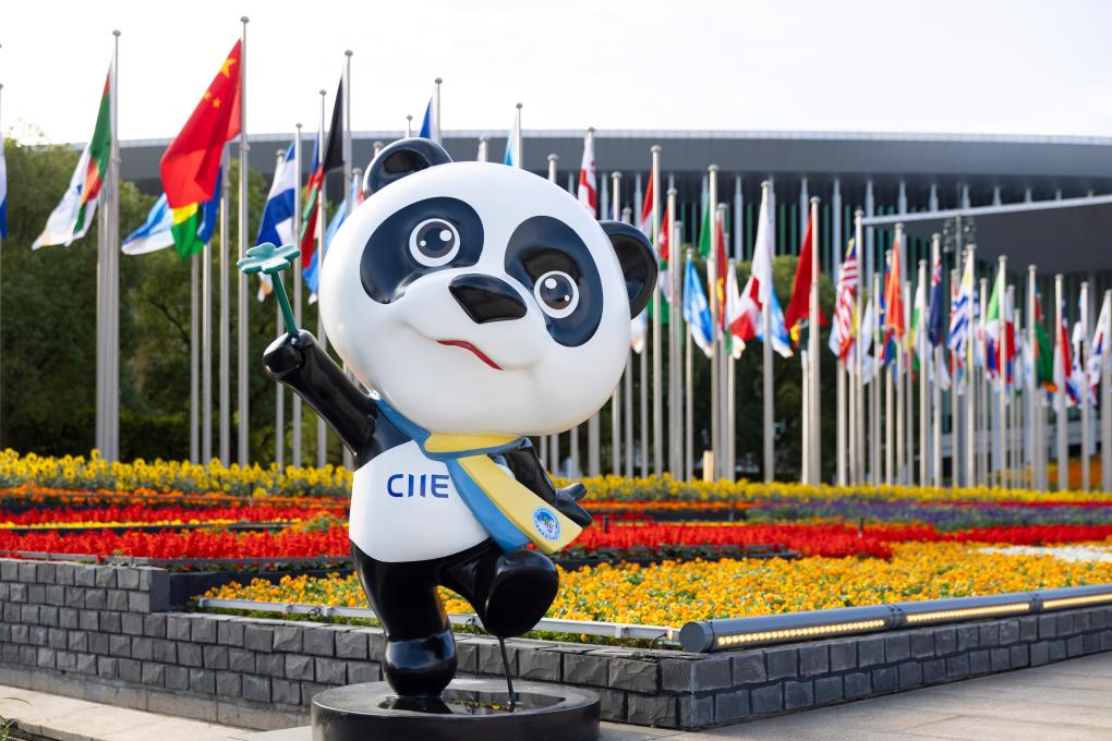 10日、国家エキシビション・コンベンションセンター(上海)の南広場に設置された輸入博マスコット「進宝(ジンバオ)」。(上海=新華社記者/王翔)