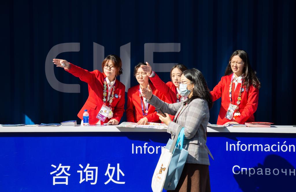 10日、国家エキシビション・コンベンションセンター(上海)で、来場者に道案内をするボランティア。(上海=新華社記者/田薇薇)