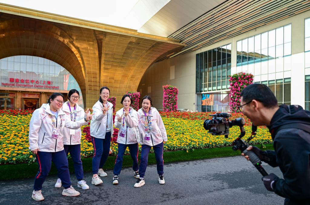 10日、国家エキシビション・コンベンションセンター(上海)で記念撮影するボランティア。(上海=新華社記者/蔡湘鑫)