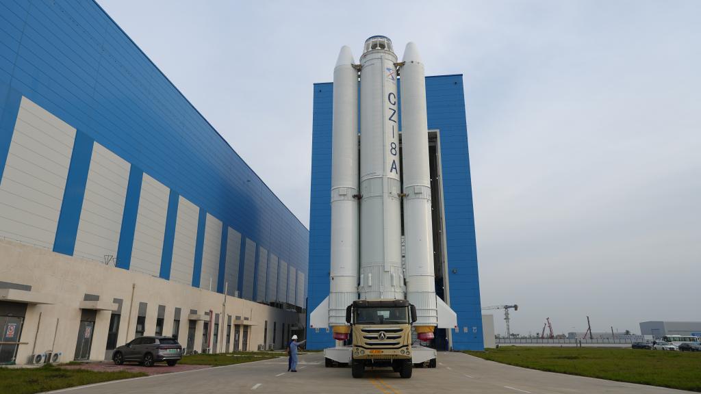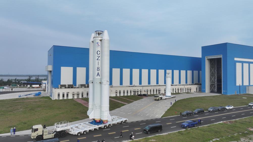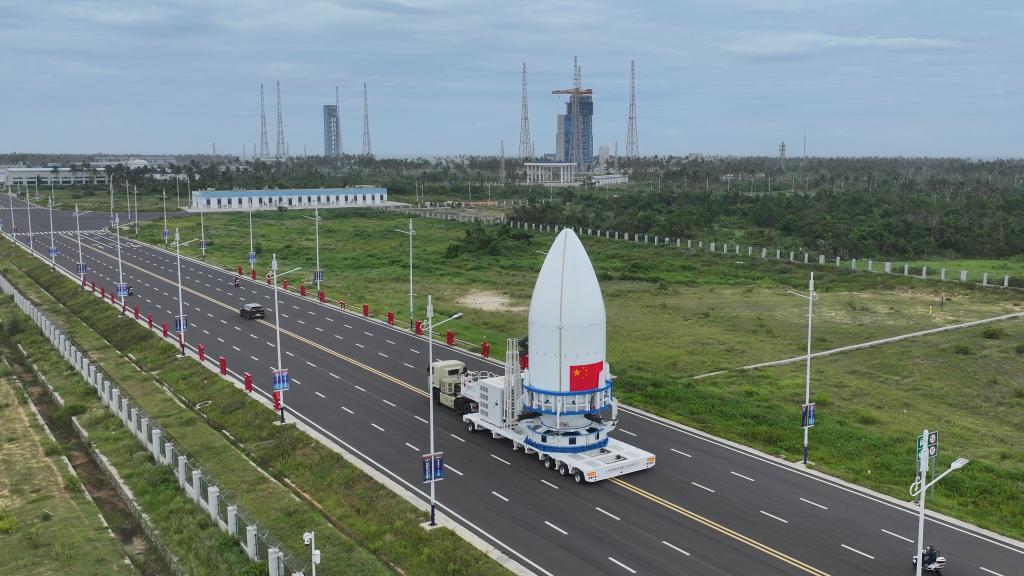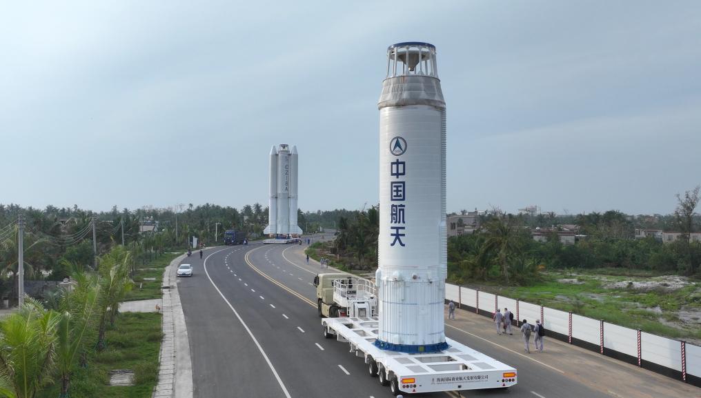 11日、発射エリアへ移動する運搬ロケット「長征8号甲遥5」のノーズコーン。(ドローンから、海口=新華社記者/陳凱姿)