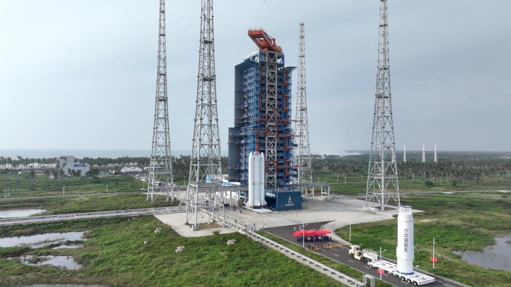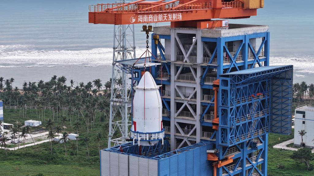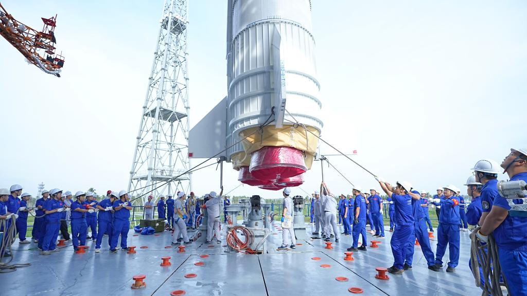 11日、運搬ロケット「長征8号甲遥5」の吊り上げ作業。(海口=新華社記者/陳凱姿)
