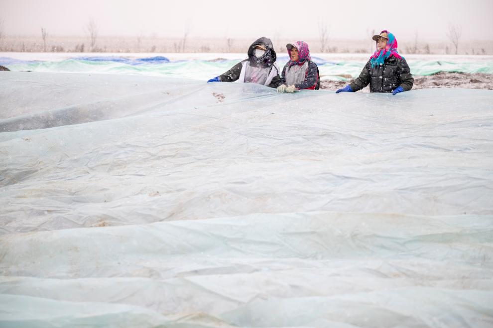 6日、撫遠市のクランベリー栽培拠点で枝を覆う作業員。(撫遠=新華社記者/張濤)