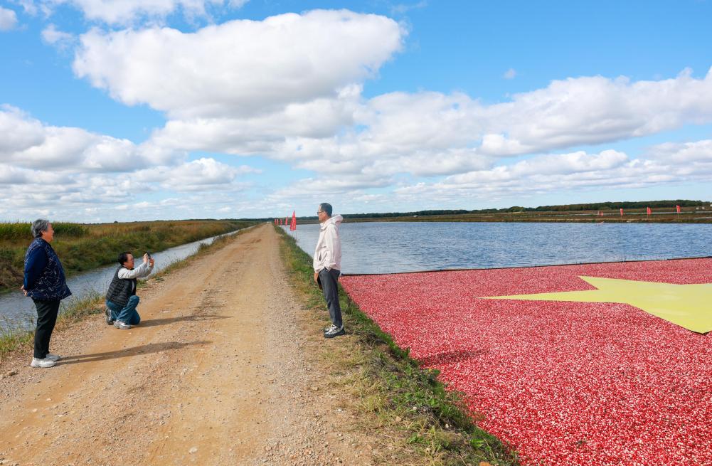 撫遠市のクランベリー栽培拠点で写真を撮る観光客。(9月26日撮影、撫遠=新華社配信/韓睿)