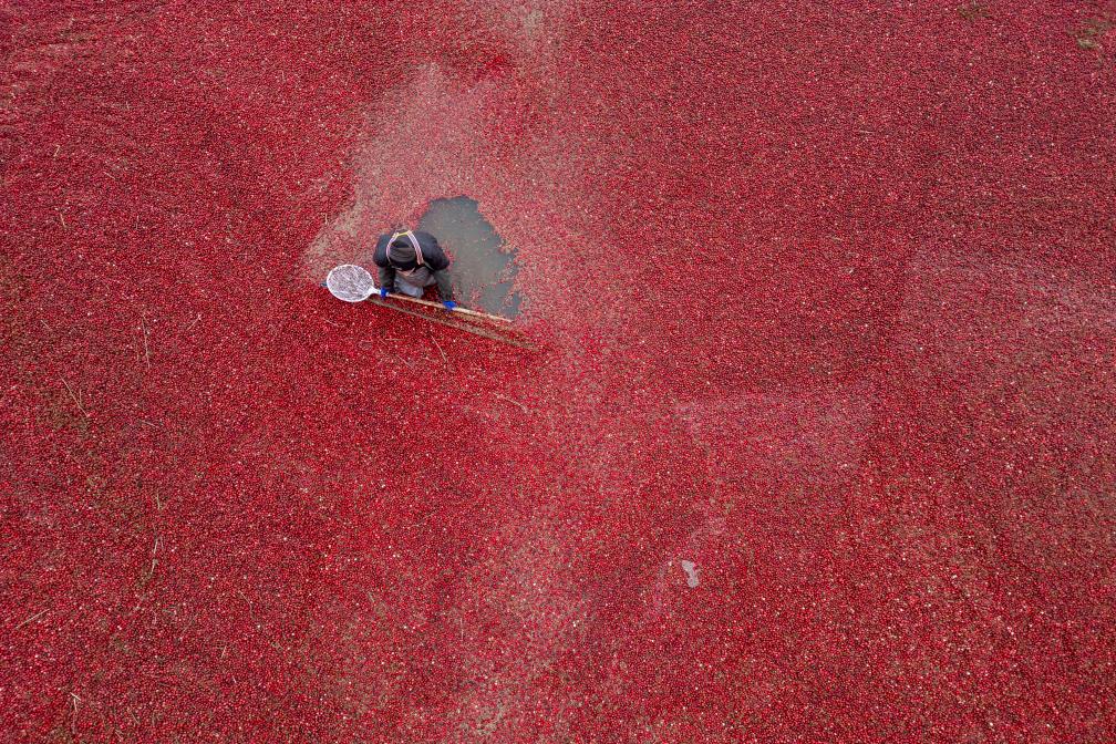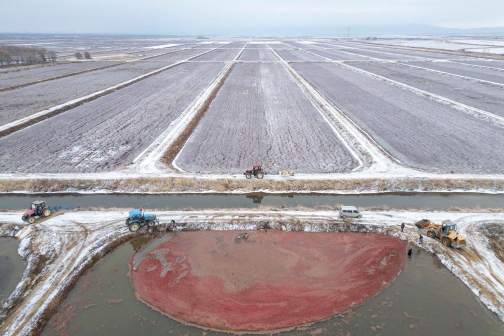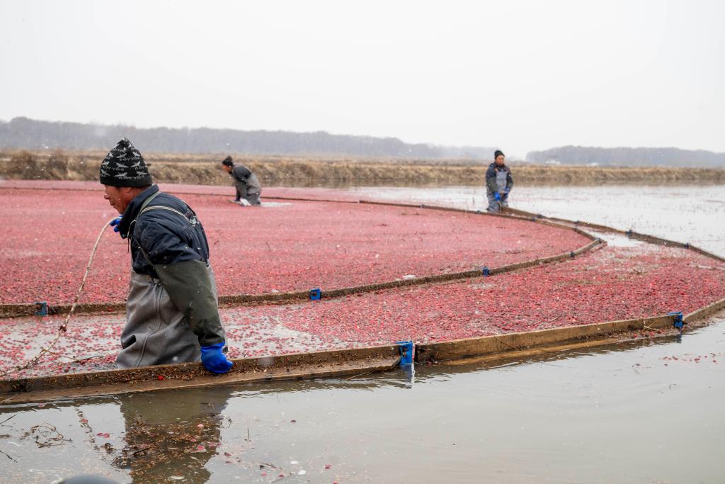 6日、撫遠市のクランベリー栽培拠点で、畑に水を張り、浮かんだ果実を収穫する作業員。(撫遠=新華社記者/張濤)