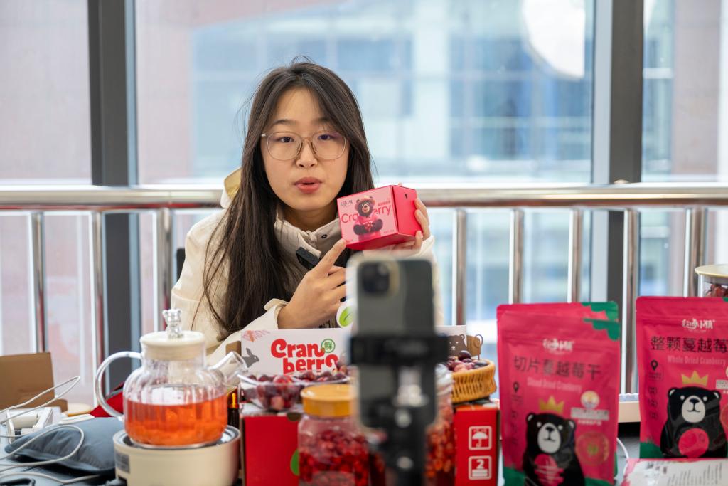 6日、クランベリーの栽培・加工などを手がける撫遠紅海植業で行われたライブ配信を通じた商品紹介。(撫遠=新華社記者/張濤)