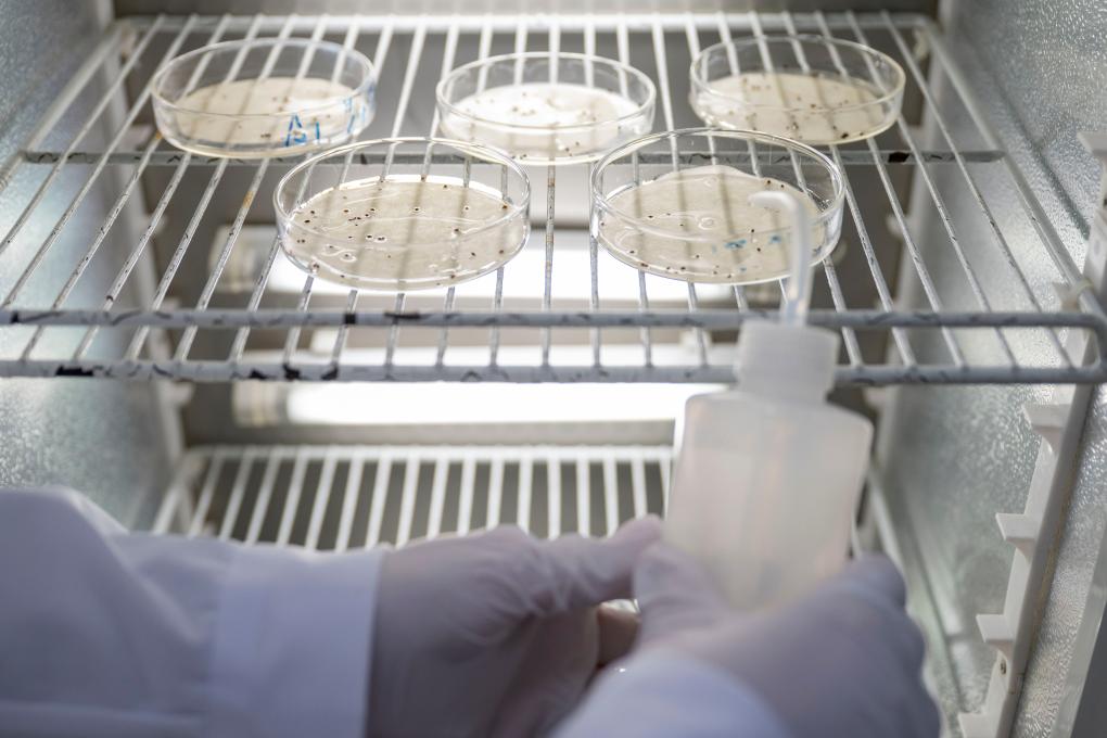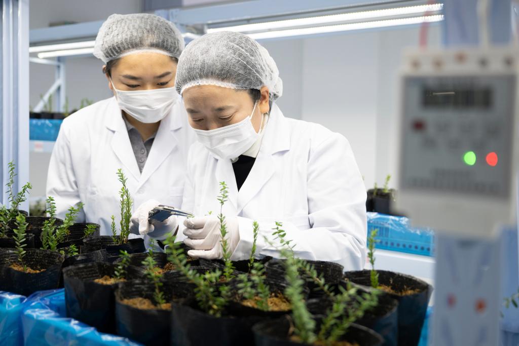 6日、撫遠市にあるクランベリー研究開発センターのスマート培養室で、種子の状態を確認する従業員。(撫遠=新華社記者/張濤)