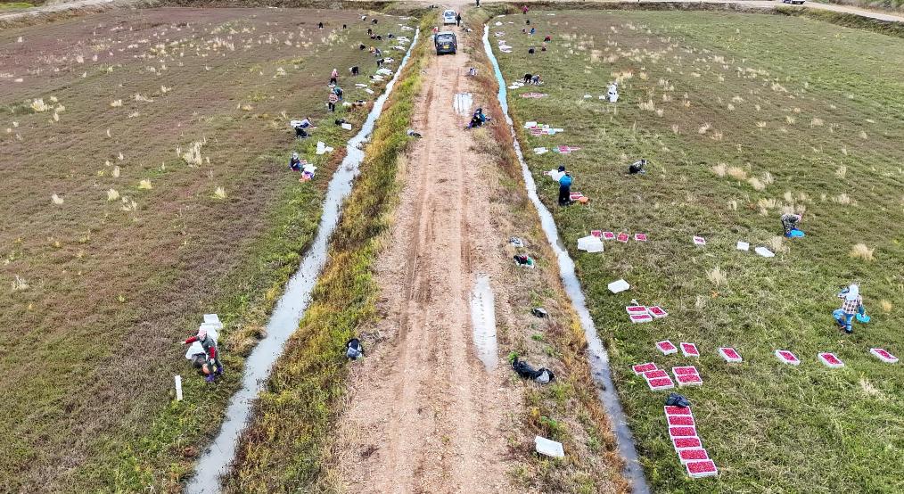 6日、撫遠市のクランベリー栽培拠点で行われた収穫作業。(ドローンから、撫遠=新華社記者/張濤)