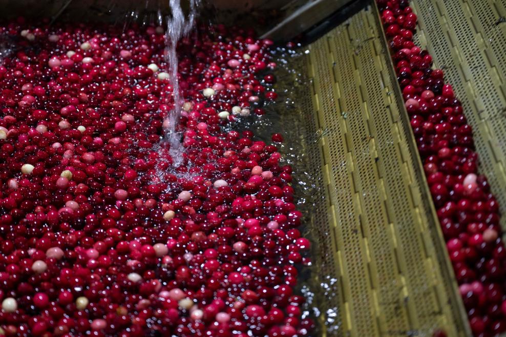 6日、クランベリーの栽培・加工などを手がける撫遠紅海植業の工場で洗浄される果実。(撫遠=新華社記者/張濤)