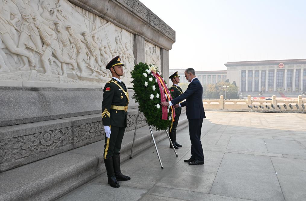 【新華社北京11月12日】国賓として中国を訪問したスペイン国王フェリペ6世は12日午前、北京の天安門広場を訪れ、人民英雄紀念碑に献花した。