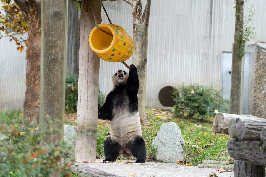 【新華社成都11月12日】中国四川省のジャイアントパンダ保護研究センター臥竜神樹坪基地で、パンダの「小奇跡(シャオチージー)」がタケノコを取りに行こうとする姿が撮影された。