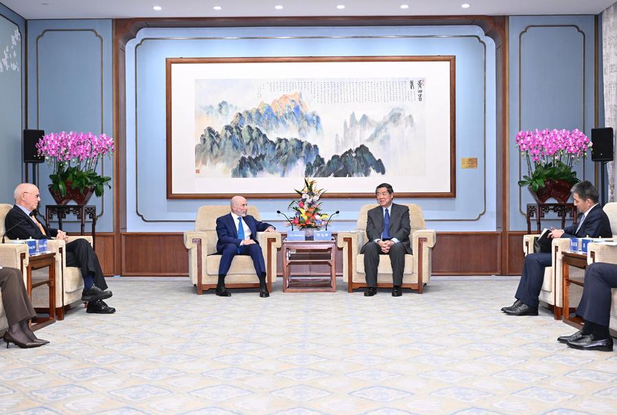 12日、米中関係全国委員会のグリーンバーグ理事会副議長、オーリンズ会長と会見する何立峰氏。(北京=新華社記者/岳月偉)