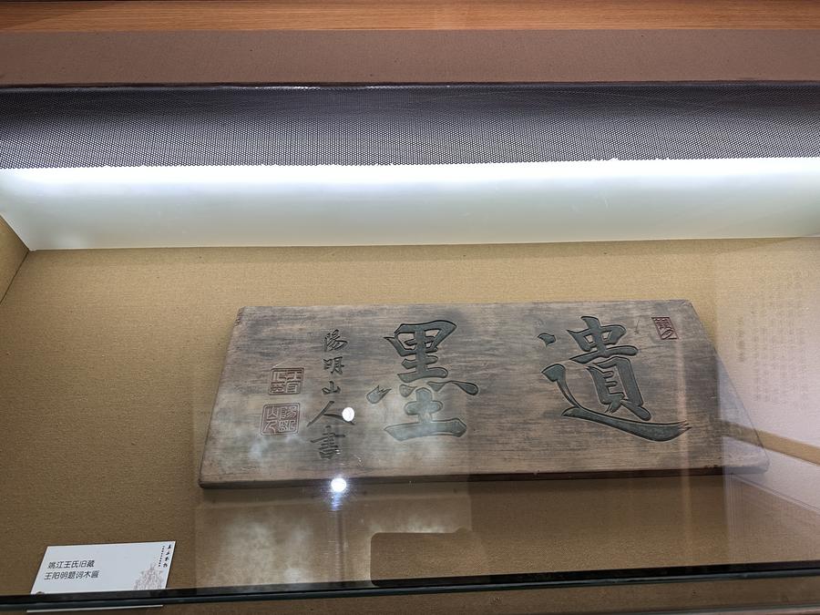 王陽明旧居で展示されている王陽明が揮毫(きごう)した木製扁額。(10月30日撮影、余姚=新華社記者/邱虹)