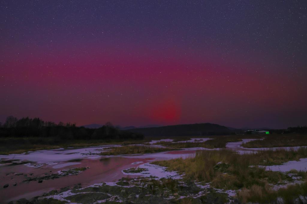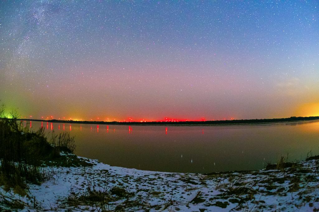 13日、黒竜江省ハルビン市を流れる呼蘭河のほとりで撮影したオーロラ。(ハルビン=新華社配信/李鑫)