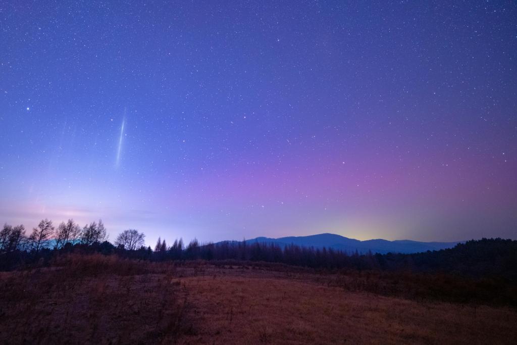 12日、黒竜江省尚志市亜布力(ヤブリ)鎮で撮影したオーロラと光柱。(尚志=新華社配信/劉大鵬)