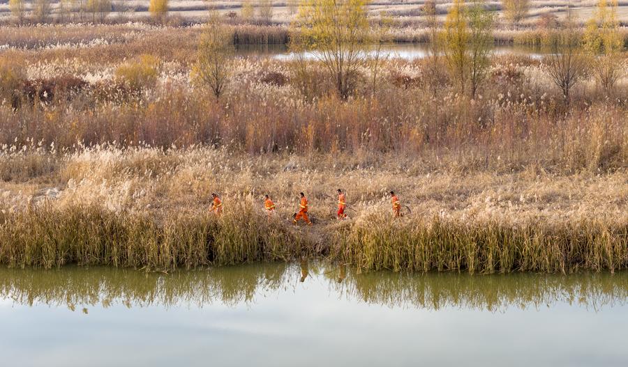 11日、寧夏平羅天河湾国家湿地公園を巡回する職員。(石嘴山=新華社記者/楊植森)