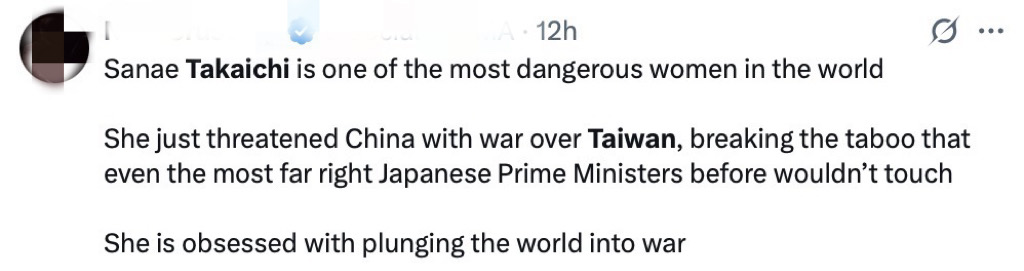 高市氏の発言の危険性を指摘するX(旧ツイッター)の投稿。(北京=新華社配信)