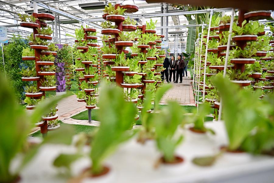 10月31日、大運河堤頂路沿いの河北省滄州市の青県司馬荘村にあるスマート野菜温室を見学する観光客。(石家荘=新華社記者/牟宇)