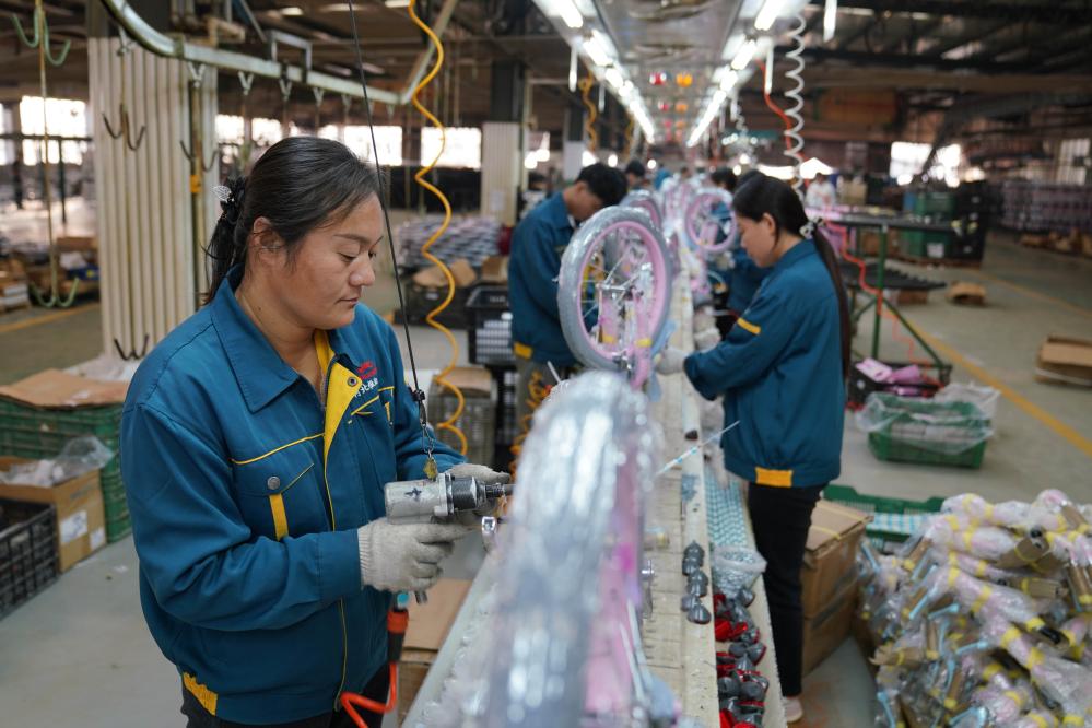 河北省平郷県の幼児用乗り物メーカーで製品を組み立てる従業員。(2024年10月24日撮影、平郷=新華社記者/牟宇)
