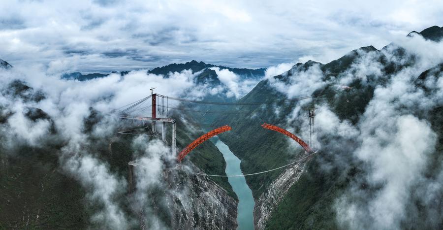10日、貴州省で建設が進む古牛河特大橋。(パノラマ写真、ドローンから、貴陽=新華社記者/楊文斌)