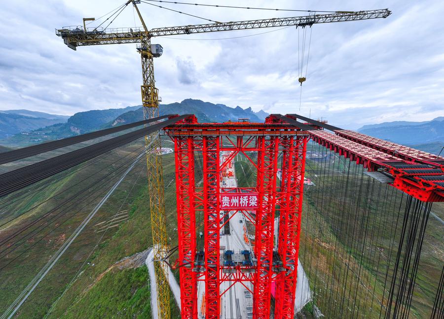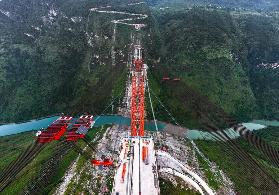 同特大橋は安盤高速道路建設の要となるプロジェクト。全長881・8メートルで、主橋は古牛河を横断し、谷底から橋面までの高さは約400メートルある。