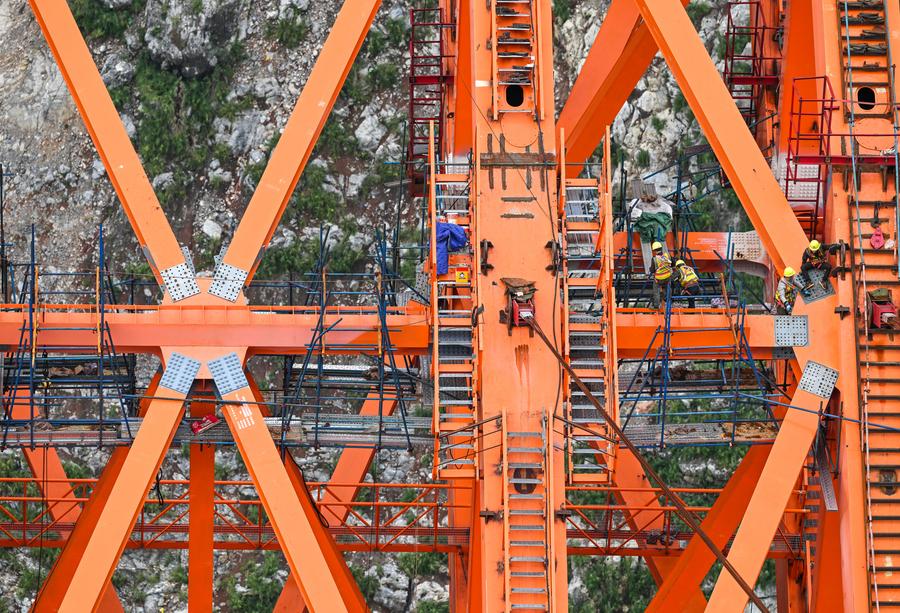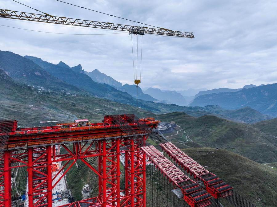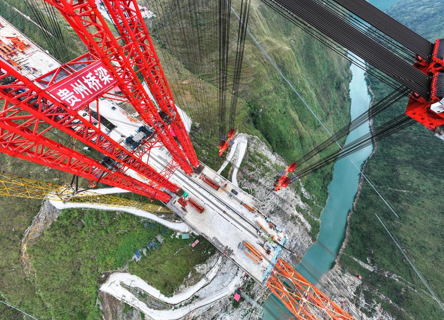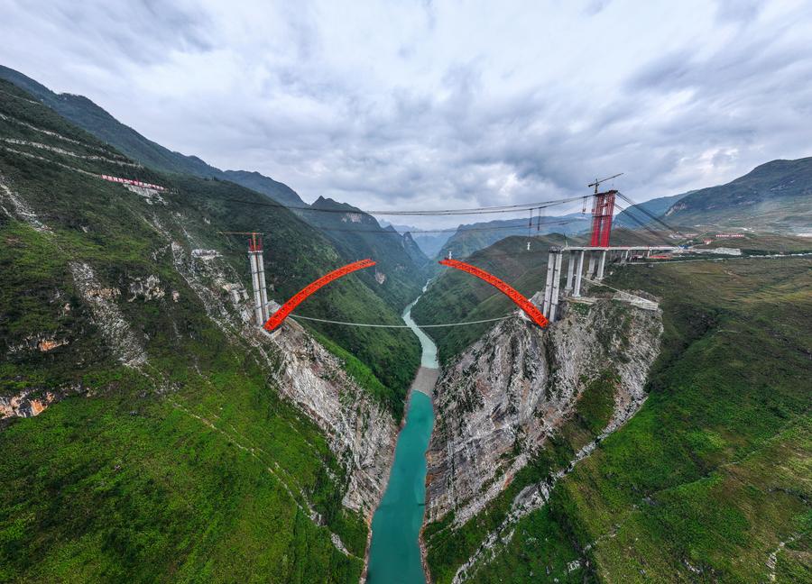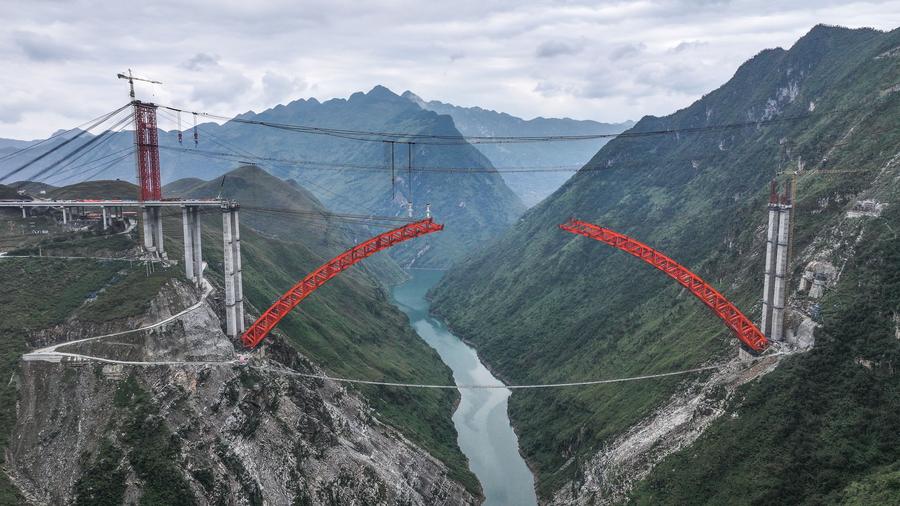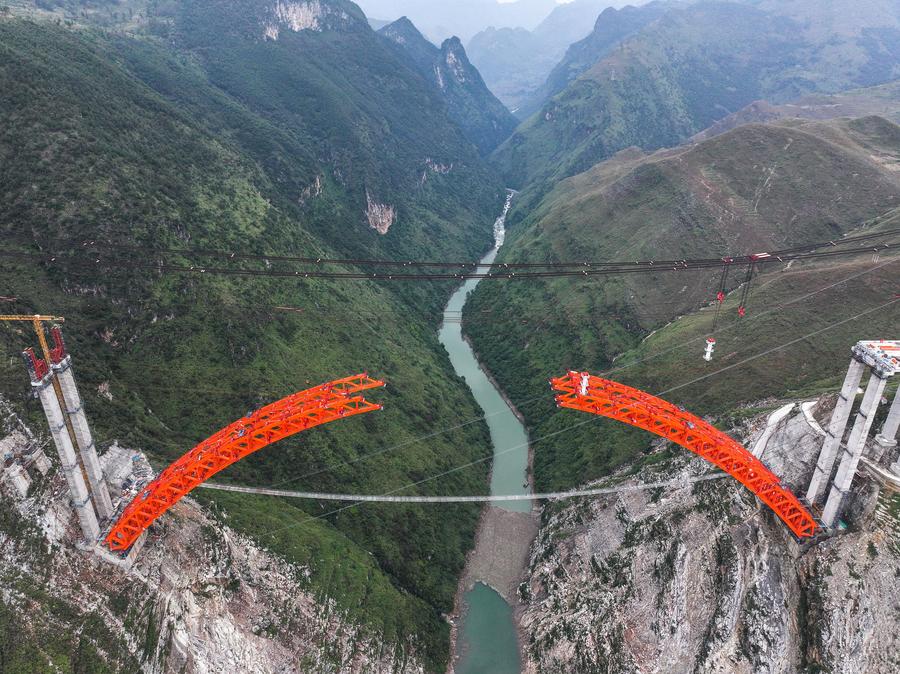 【新華社貴陽11月17日】中国貴州省で貴州橋梁集団が建設を請け負う安盤高速道路(安順市-盤州市)の古牛河特大橋プロジェクトは、順調に進行中で、メインアーチの接合は年内を予定している。