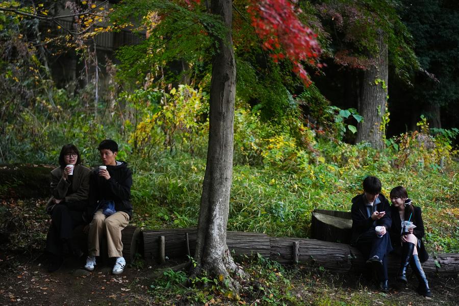 16日、東京都内の公園で休憩する観光客。(東京=新華社記者/賈浩成)
