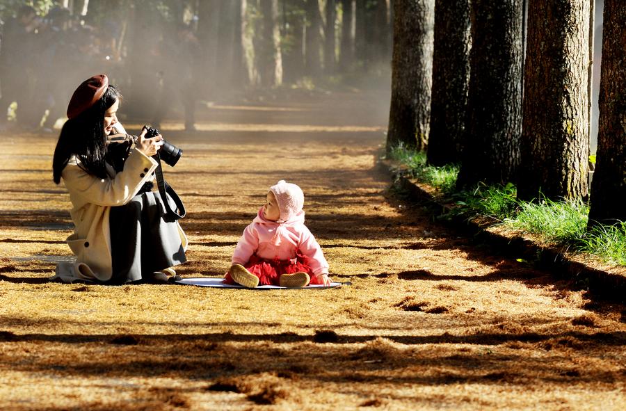 15日、江西省徳興市の大茅山風景区で撮影を楽しむ観光客。(徳興=新華社配信/卓忠偉)