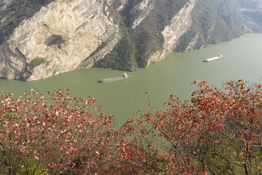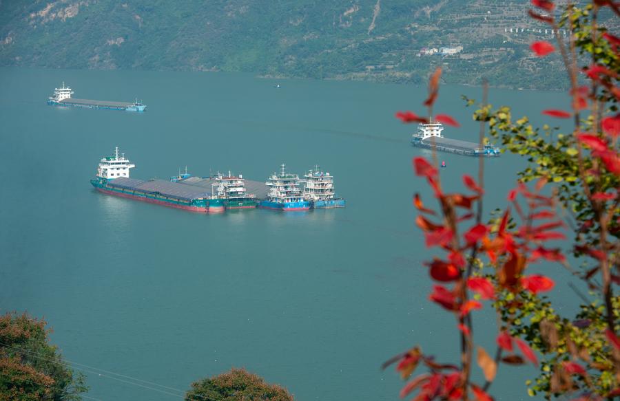 16日、湖北省宜昌市秭帰(しき)県の西陵峡を航行する船。(ドローンから、宜昌=新華社配信/王罡)