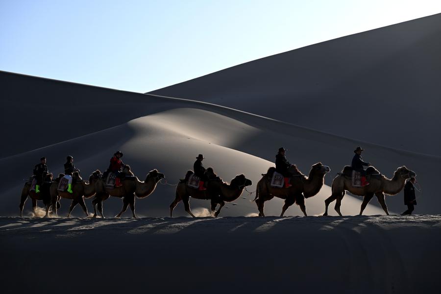 15日、甘粛省敦煌市の鳴沙山・月牙泉風景区でラクダに乗る観光客。(敦煌=新華社配信/張暁亮)