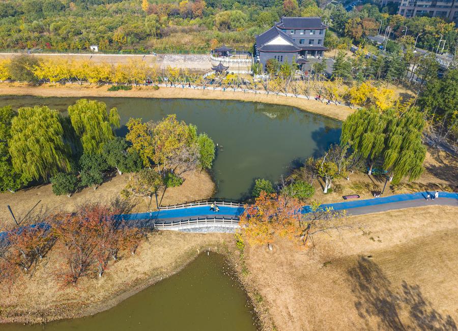 16日、空から見た江蘇省淮安市の古淮河文化生態風景区。(ドローンから、淮安=新華社配信/張建)