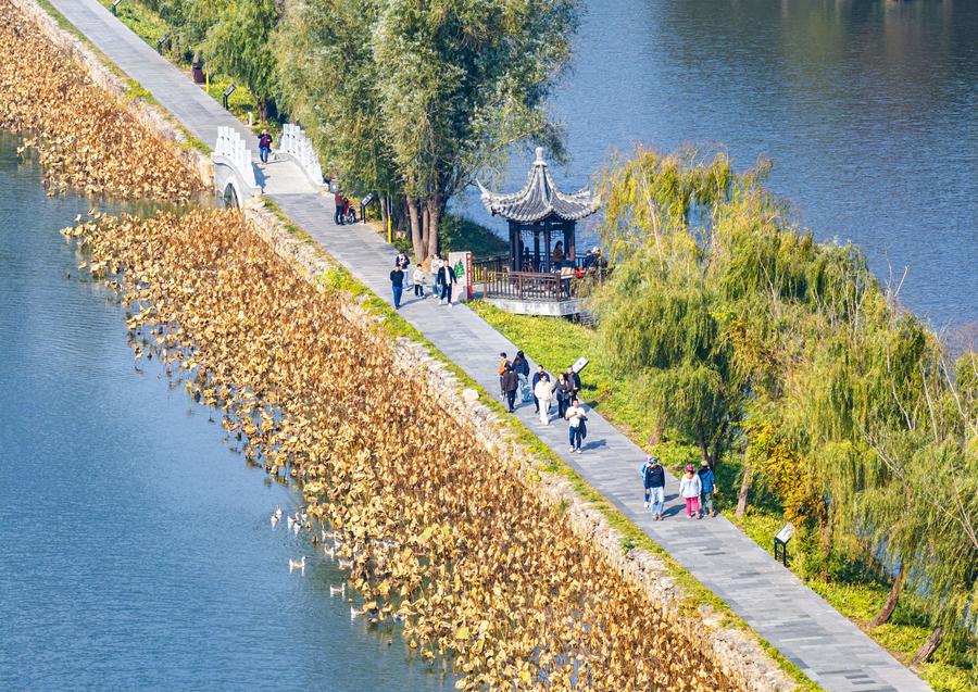15日、江蘇省興化市の里下河国家湿地公園を散策する観光客。(ドローンから、興化=新華社配信/周社根)