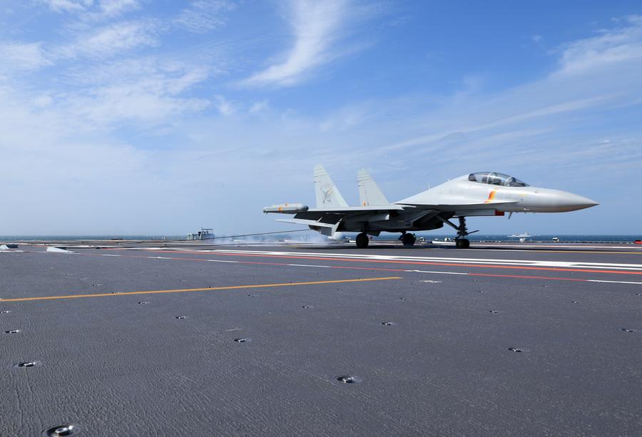 着艦する艦載機「殲-15DT(J15DT)」。(三亜=新華社配信)