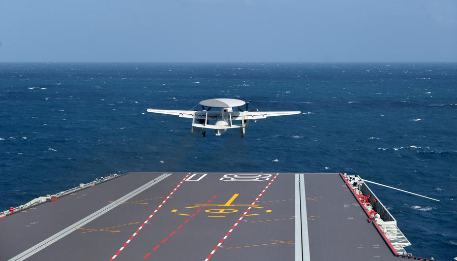 電磁式カタパルト(射出機)で発艦する艦載早期警戒機「空警-600(KJ600)」。(三亜=新華社配信)