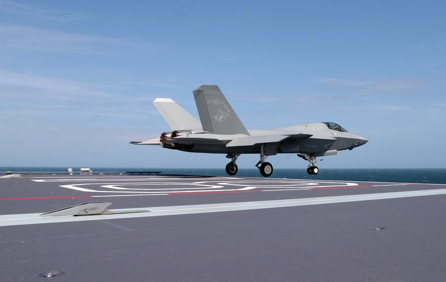 電磁式カタパルト(射出機)で発艦する艦載機「殲-35(J35)」。(三亜=新華社配信)