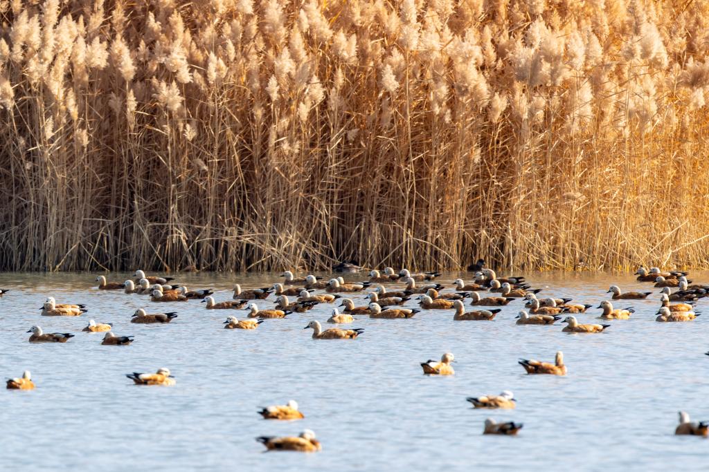 12日、張掖市黒河湿地国家級自然保護区の高台県区間の湖で羽を休め、餌を探すアカツクシガモなどの渡り鳥。(張掖=新華社記者/張智敏)