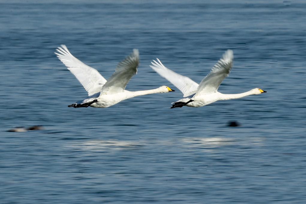 12日、張掖市黒河湿地国家級自然保護区の高台県区間の湖の上を飛ぶオオハクチョウ。(張掖=新華社記者/張智敏)
