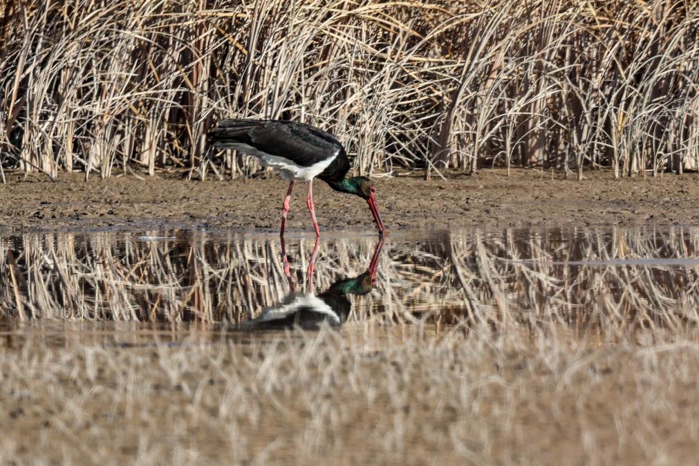 12日、張掖市黒河湿地国家級自然保護区の高台県区間に広がる浅瀬で餌を探すナベコウ。(張掖=新華社記者/郎兵兵)