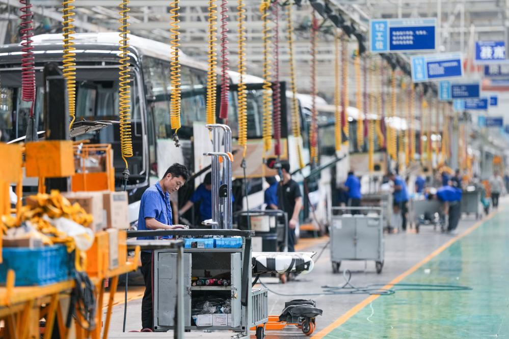 江蘇省揚州市のバスメーカー・揚州亜星客車の工場で働く作業員。(5月22日撮影、揚州=新華社記者/李博)