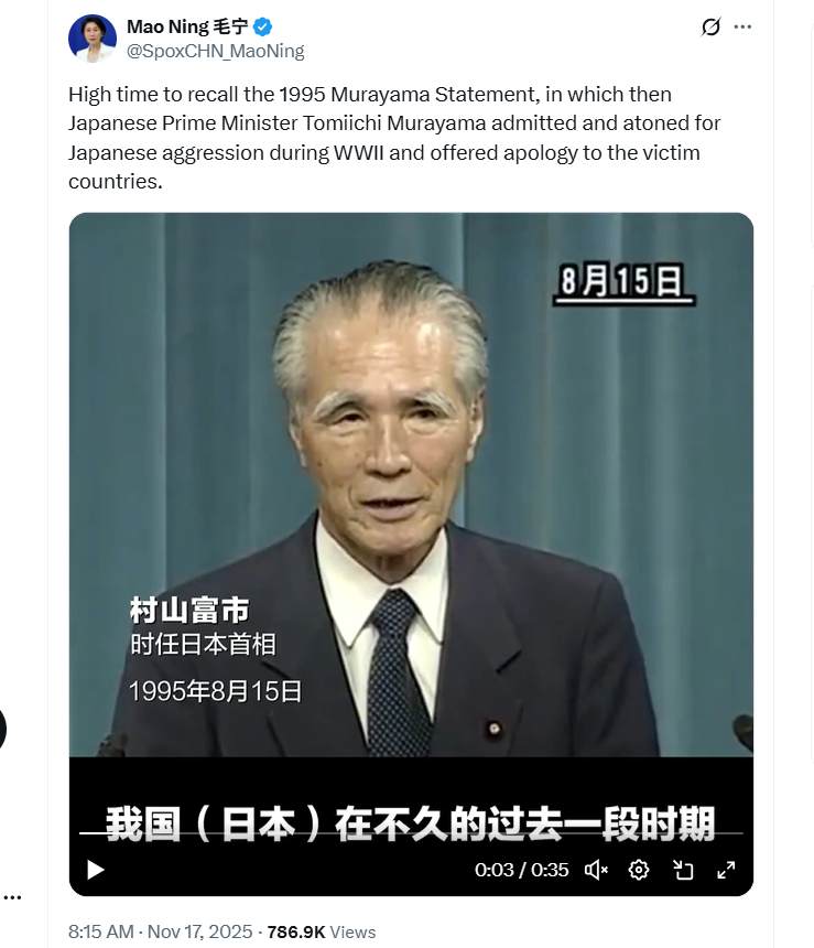 高市氏の発言が中日関係を緊張させる中、日本がいかなる姿勢を取るのかが改めて問われている。村山談話が示した歴史観と平和理念は、今もなお重い意味を持つ。政治指導者は、その重さを真摯(しんし)に受け止める責任がある。(記者/彭純、胡暁格)