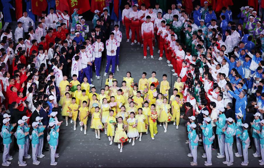 21日、第15回全国運動会の閉会式に出席した選手ら。(深圳=新華社記者/毛思倩)