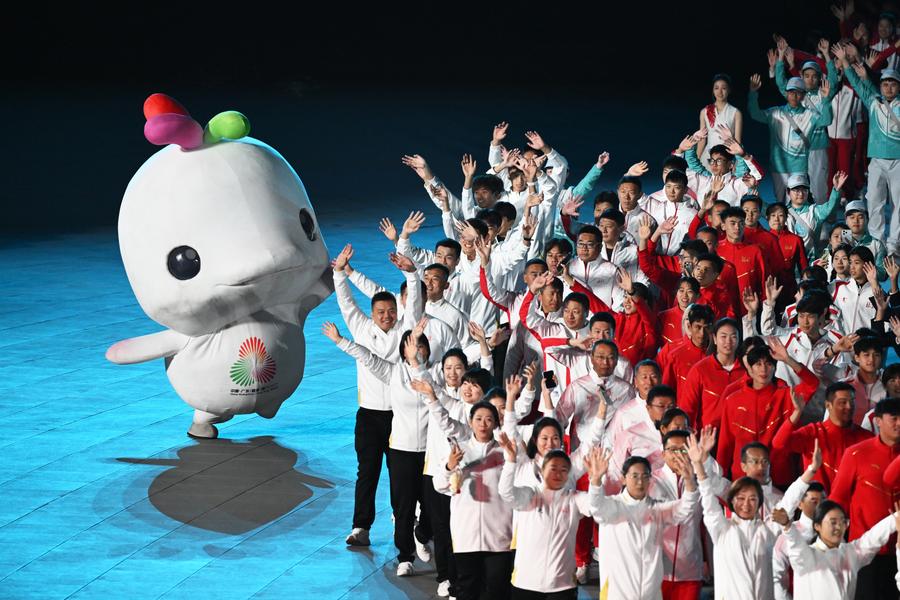 21日、第15回全国運動会の閉会式で入場する選手ら。(深圳=新華社記者/連振)