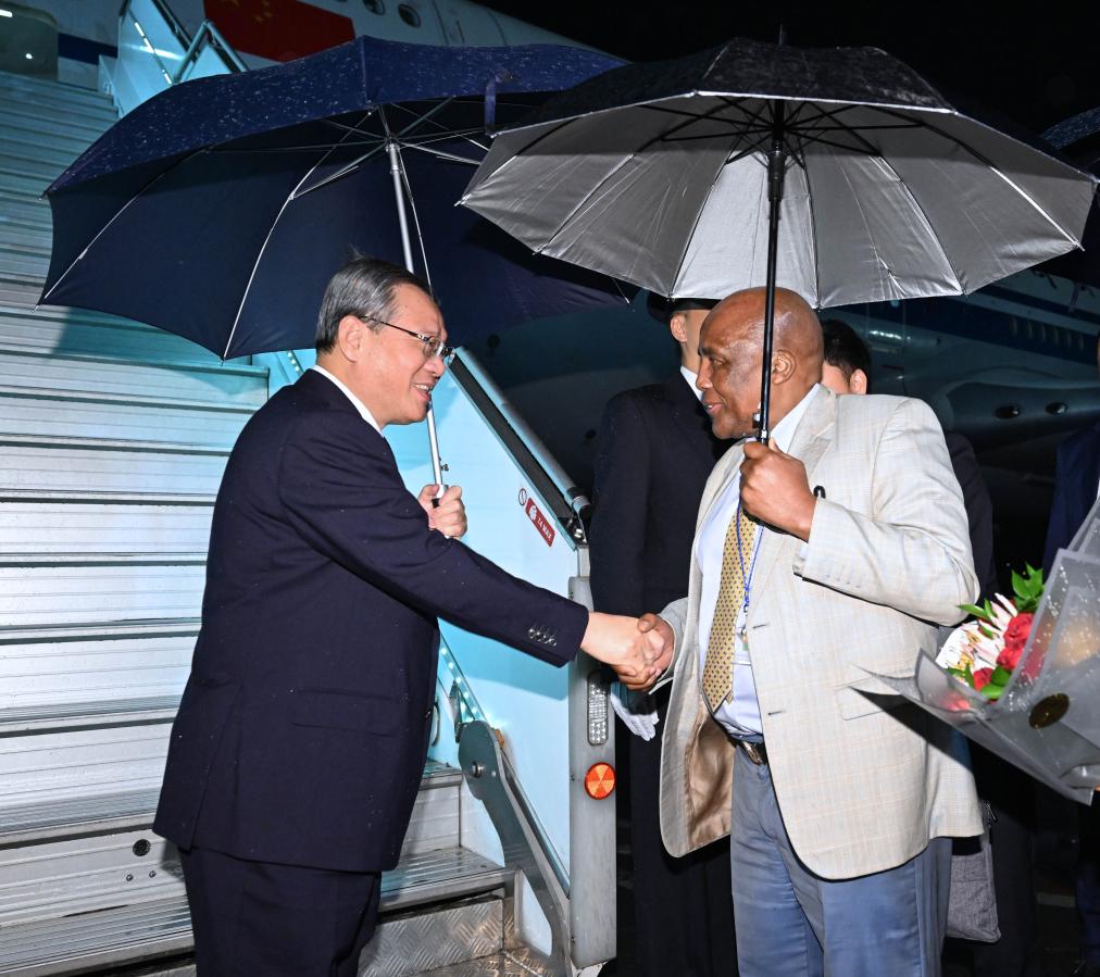 20日、ヨハネスブルグで出迎えを受ける李強総理(左)。(ヨハネスブルグ=新華社記者/饒愛民)