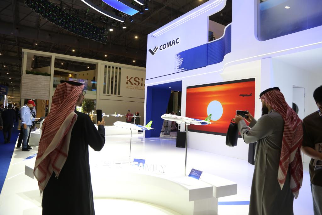 17日、ドバイ航空ショーで中国商用飛機のブースを見学する来場者。(ドバイ=新華社記者/温新年)