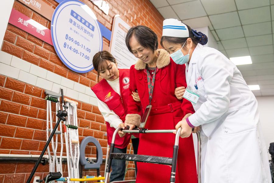 湖南省長沙市望城区の中南社区(コミュニティー)で、リハビリ器具を使う住民(中央)をサポートするボランティアと医療スタッフ。(11月6日撮影、長沙=新華社記者/陳思汗)