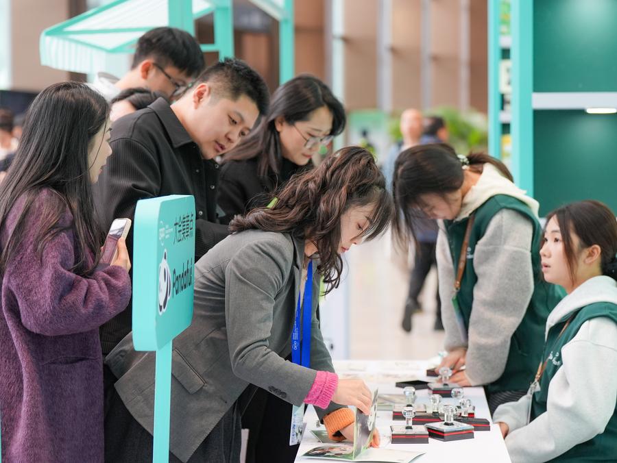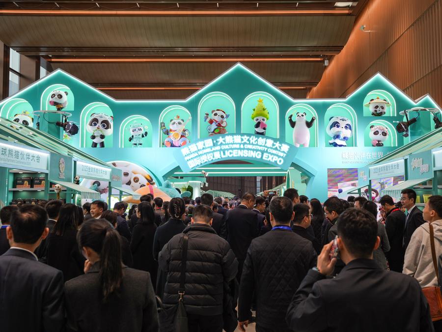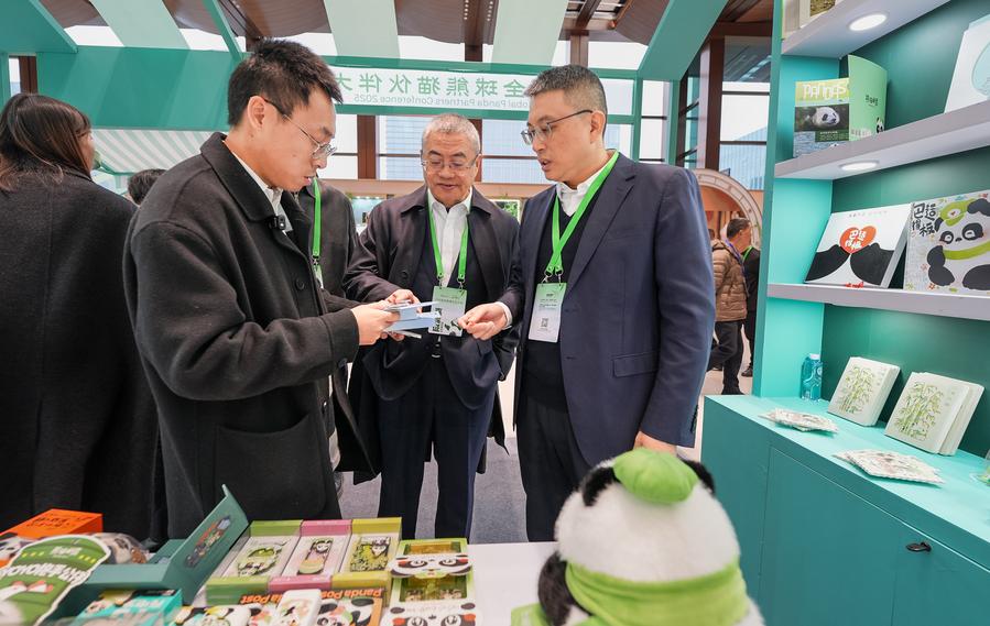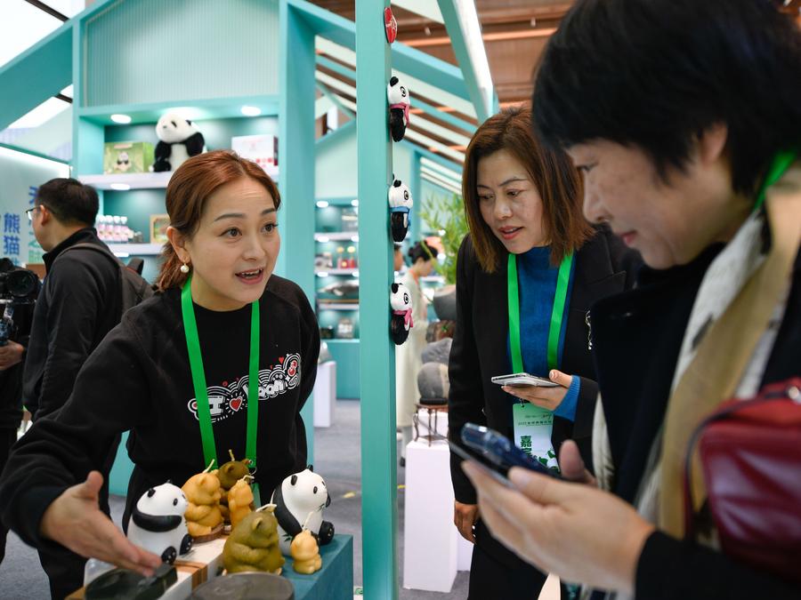 21日、グローバルパンダパートナー大会でパンダ関連の製品を見る来賓。(成都=新華社記者/江宏景)
